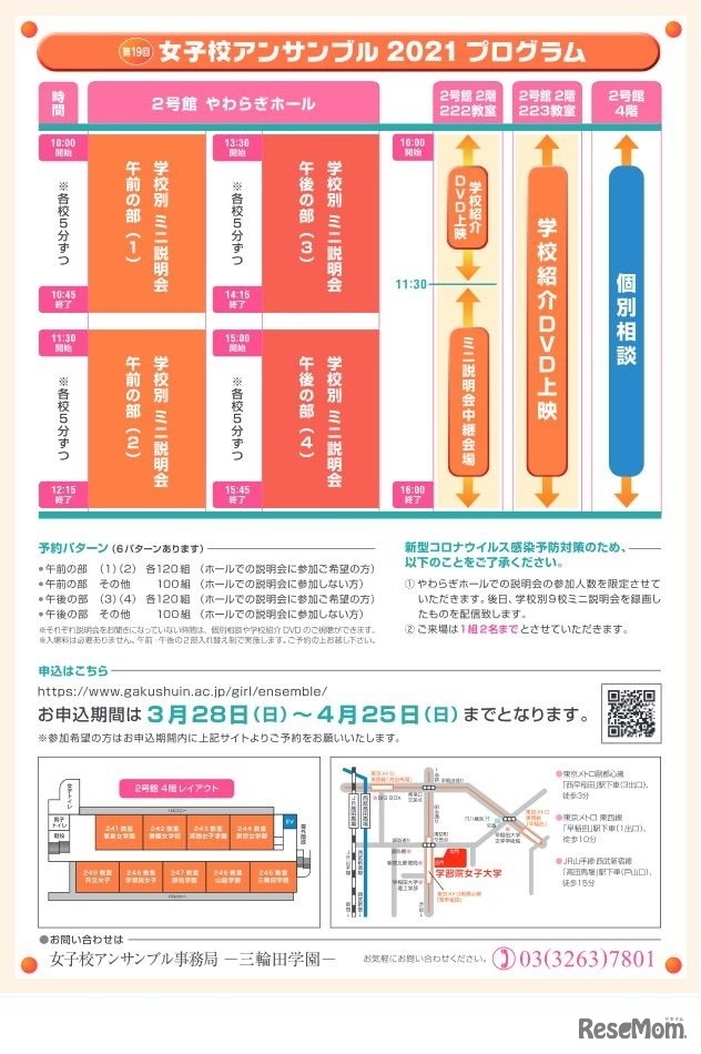 東京都内の伝統ある女子中学校9校が参加する合同説明会「女子校アンサンブル」が2021年4月29日、学習院女子大学で開催される。学校別の個別相談やミニ説明会、学校紹介DVD上映などが予定されている。入場無料。事前申込制。