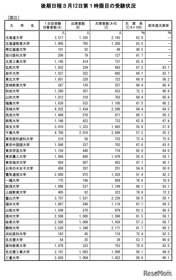 文部科学省は2021年3月12日、2021年度国公立大学入学者選抜 後期個別学力検査等第1日目第1時限目(受験生個々についての第1時限目)の受験状況を発表した。国立・公立とも欠席率は62.2%だった。