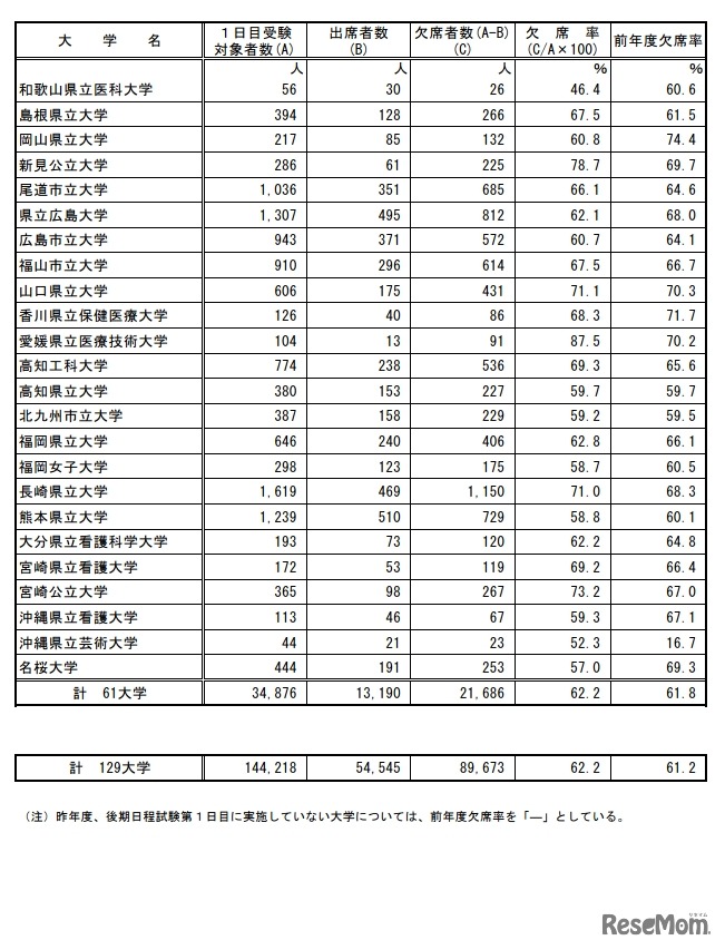 文部科学省は2021年3月12日、2021年度国公立大学入学者選抜 後期個別学力検査等第1日目第1時限目(受験生個々についての第1時限目)の受験状況を発表した。国立・公立とも欠席率は62.2%だった。