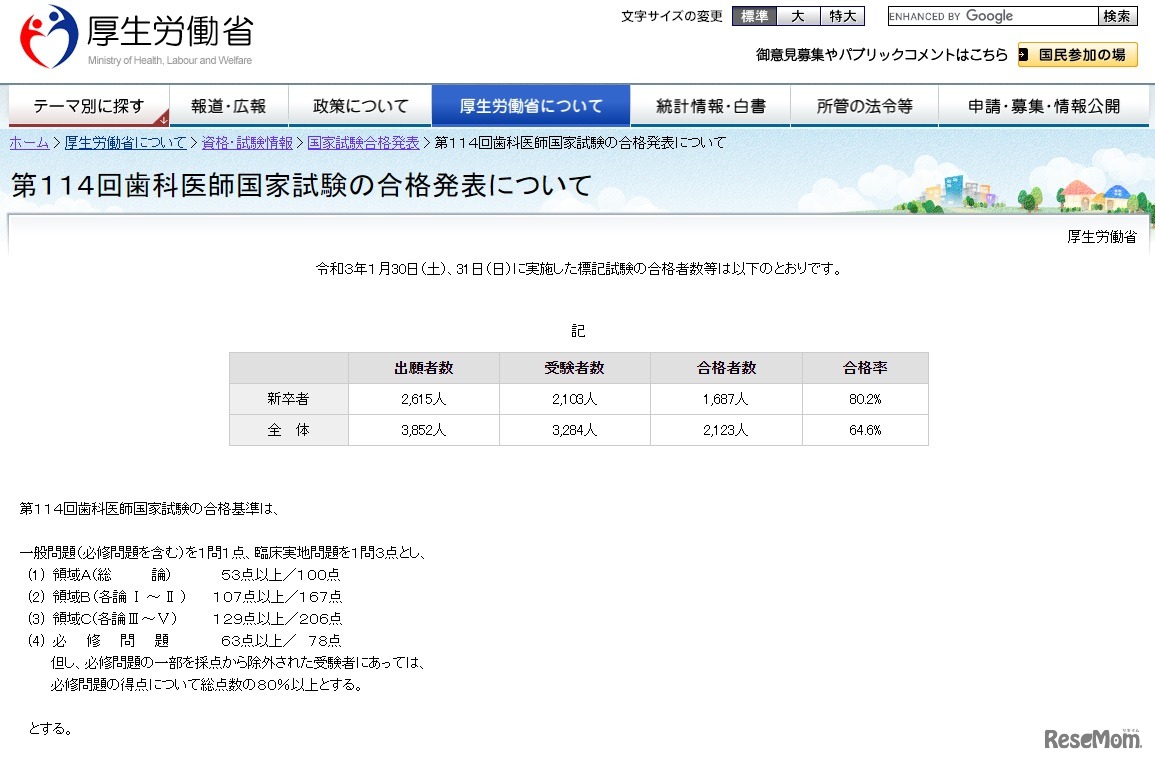 厚生労働省は2021年3月16日午後2時、医師国家試験と歯科医師国家試験の合格発表を行った。合格率は、医師が91.4%、歯科医師が64.6%。いずれも前年(2020年)より合格率が減少した。