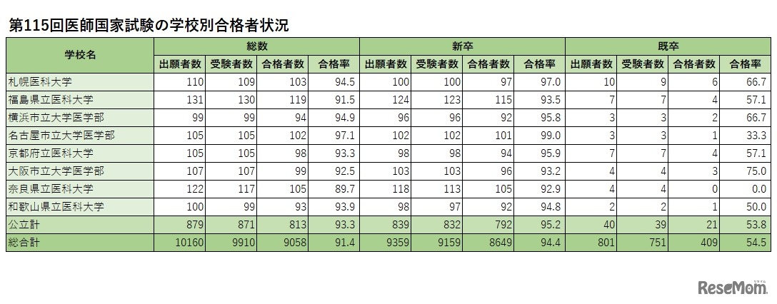画像:厚生労働省医政局医事課試験免許室(2021年3月16日)第115回医師国家試験の学校別合格者状況をもとにリセマム編集部が作成 学校別合格者状況(公立)
