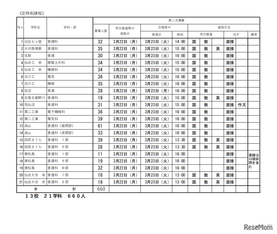 令和3年度宮城県公立高等学校入学者選抜 第2次募集実施校一覧