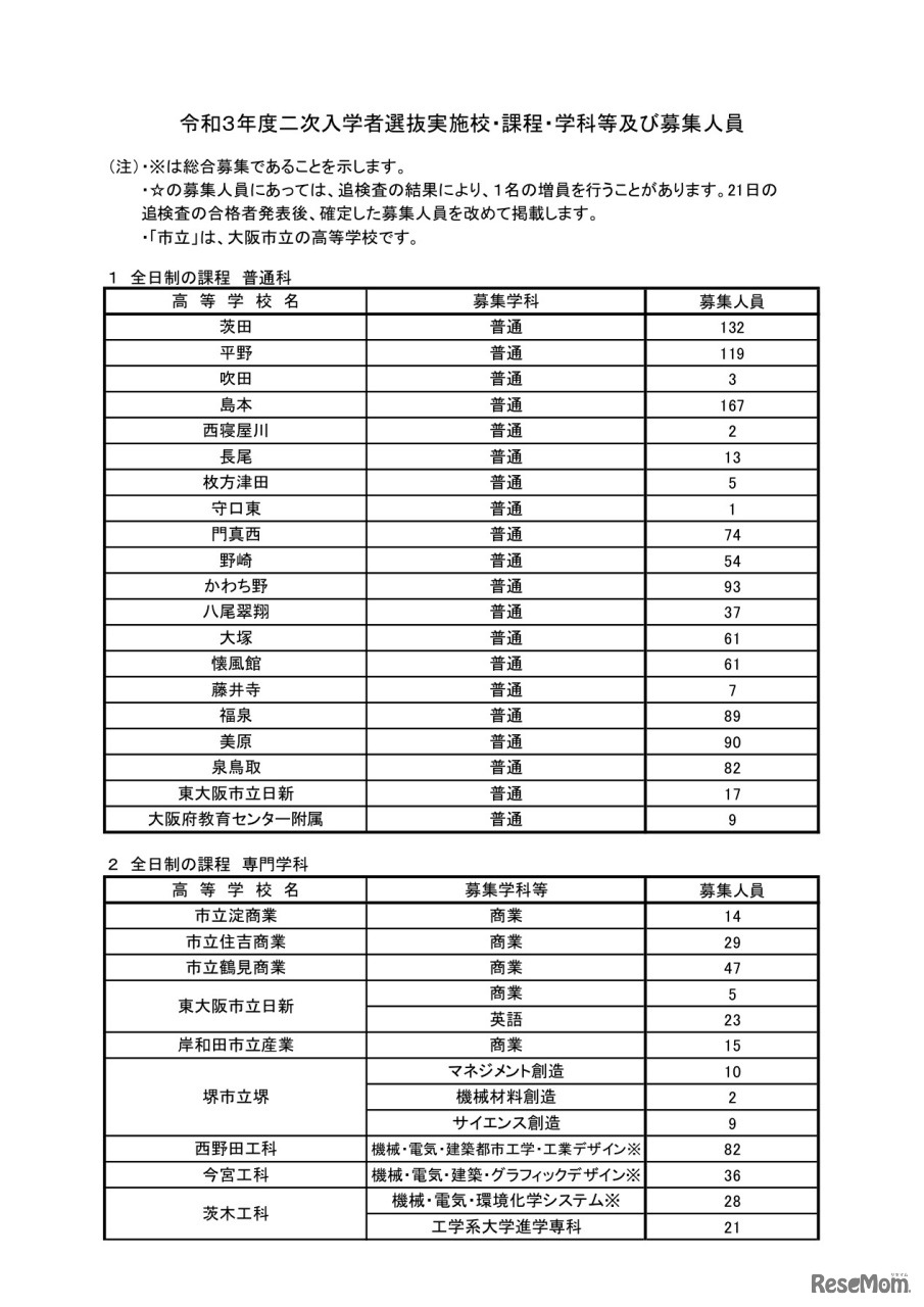 大阪府公立高等学校等入学者選抜<令和3年度二次入学者選抜実施校・課程・学科等および募集人員>