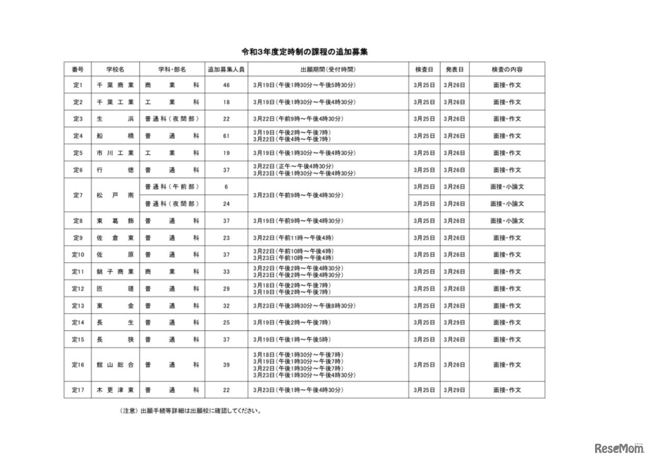 千葉県教育委員会は2021年3月17日、2021年度(令和3年度)公立高等学校における第2次募集および通信制の課程の二期入学者選抜の入学許可候補者数について発表した。入学許可候補者の総数は、全日制の課程が179人、定時制の課程が26人、通信制の課程が19人。