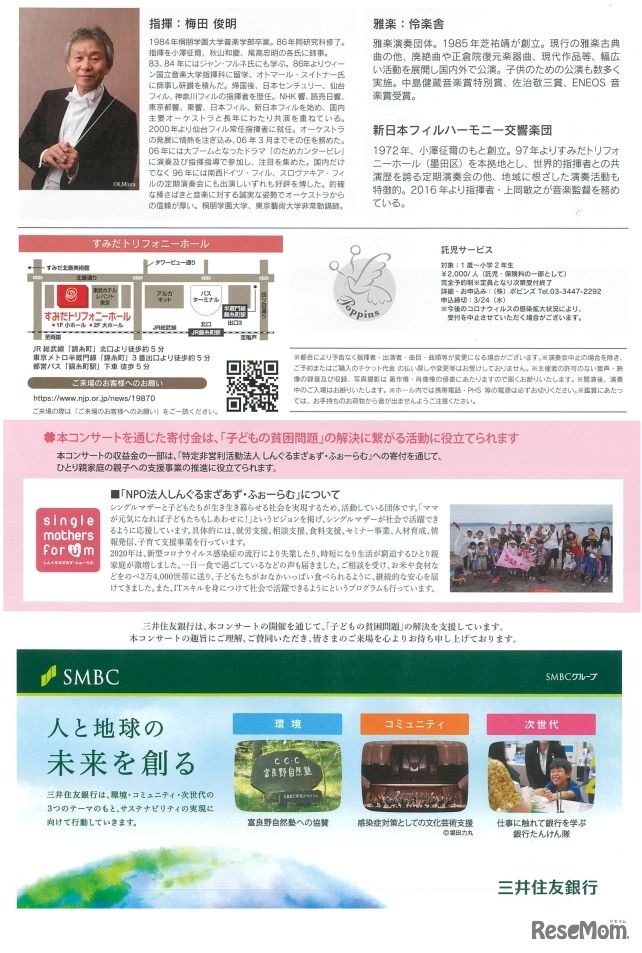 SMBC presents こどものための音楽会 雅楽とオーケストラの共演 チャリティコンサートが2021年3月31日にすみだトリフォニーホールで開催される。全席指定で、チケット料金は大人が2,000円、小学生以下(4歳以上入場可)が1,000円。