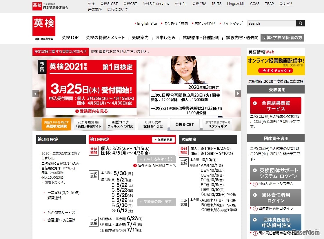 日本英語検定協会は2021年3月23日、Webサイトで「2020年度第3回実用英語技能検定二次試験C日程」の合否結果閲覧サービスを開始する。団体責任者は正午以降、個人(英ナビ!会員)は午後1時以降に公開予定。