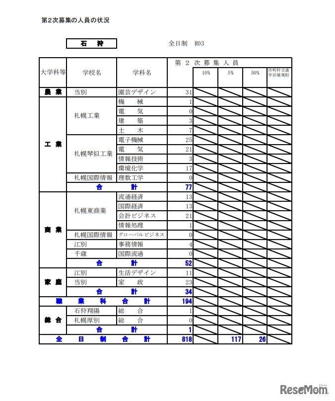 画像出典:北海道教育委員会 第2次募集の人員の状況(石狩)