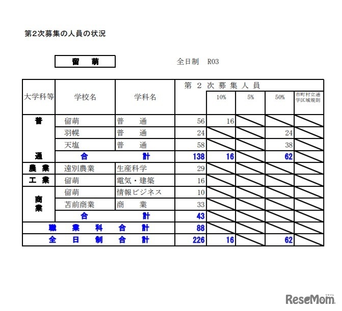 画像出典:北海道教育委員会 第2次募集の人員の状況(留萌)