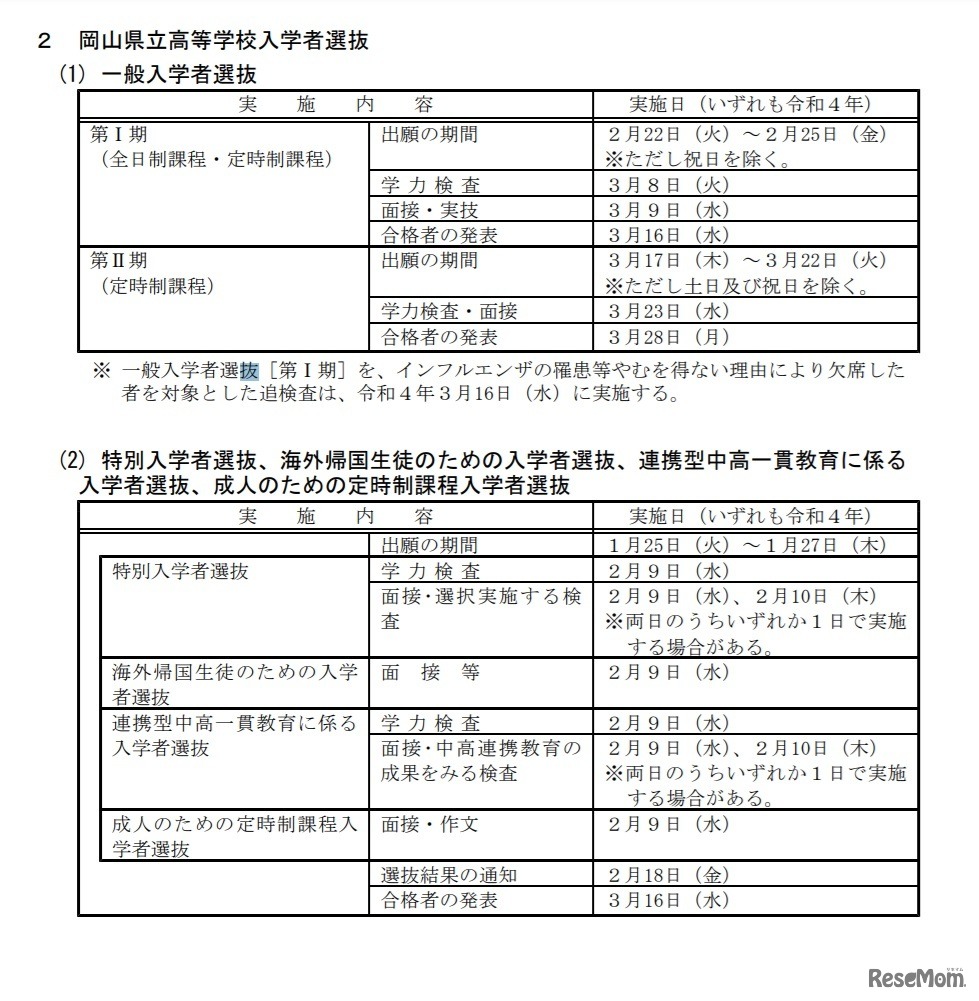 岡山県教育委員会は2021年3月19日、令和4年度(2022年度)県立中学校および県立中等教育学校ならびに県立高等学校入学者選抜日程について発表した。県立高等学校一般入学者選抜第I期は、学力検査を2022年3月8日、面接・実技を3月9日に実施する。