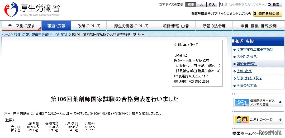 厚生労働省は2021年3月24日午後2時、第106回薬剤師国家試験の合格発表を行った。合格率は68.66%と前年(2020年)より0.92ポイント減少。新卒の合格率は85.55%だった。前年(2020年)より0.77ポイント増加した。