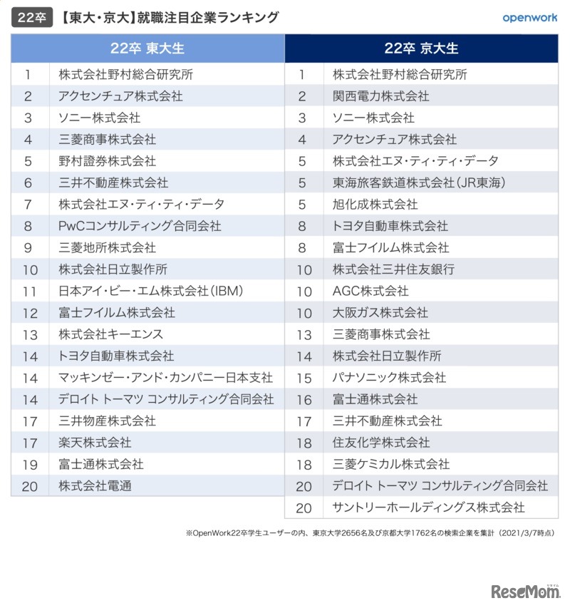 就職・転職のためのジョブマーケット・プラットフォーム「OpenWork」を運営するオープンワークは2021年3月23日、「就活生が選ぶ、就職注目企業ランキング(大学別編)」を発表した。東京大学・京都大学の1位はいずれも「野村総合研究所」であった。