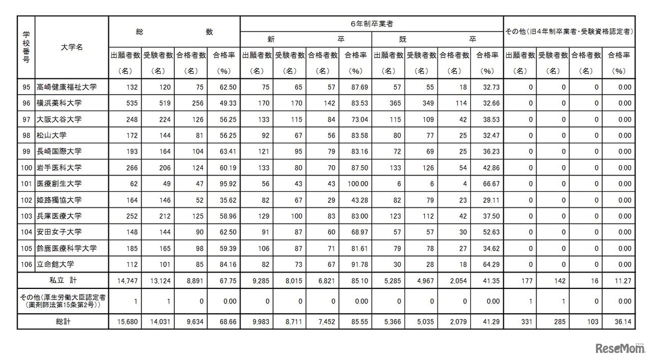 画像出典:厚生労働省 第106回薬剤師国家試験 大学別合格者数