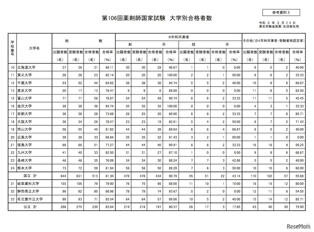 画像出典:厚生労働省 第106回薬剤師国家試験 大学別合格者数