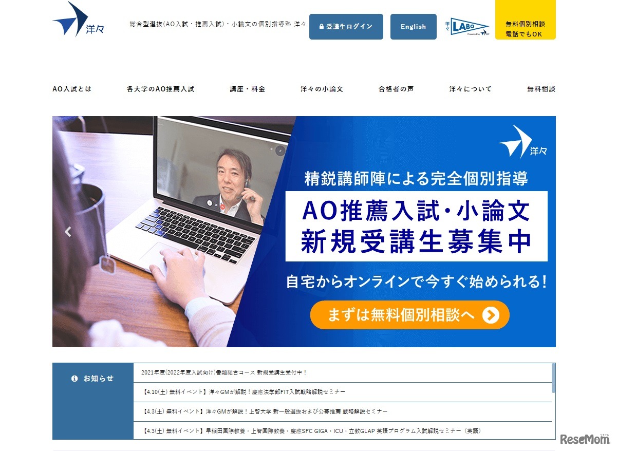 洋々は2021年4月3日、受験生および保護者を対象にした「早稲田国際教養・上智国際教養・慶應SFC GIGA・ICU・立教GLAP 英語プログラム入試解説セミナー」を開催する。会場またはオンラインにて参加できる。参加は無料。