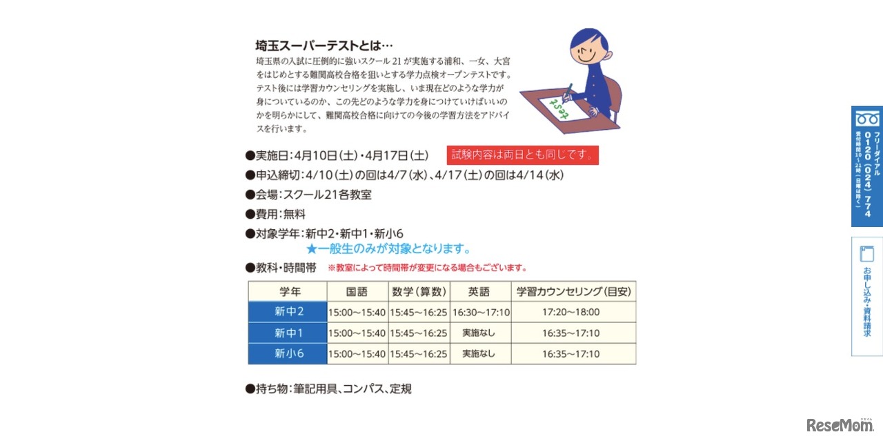 埼玉県内を中心に学習塾を展開するスクール21は2021年4月10日・17日の2日間、県立御三家と言われる浦和高校、浦和第一女子高校、大宮高校を目指す新中学1・2年生と小学6年生を対象とした学力点検オープンテスト「埼玉スーパーテスト」を開催する。一般生対象、参加無料。