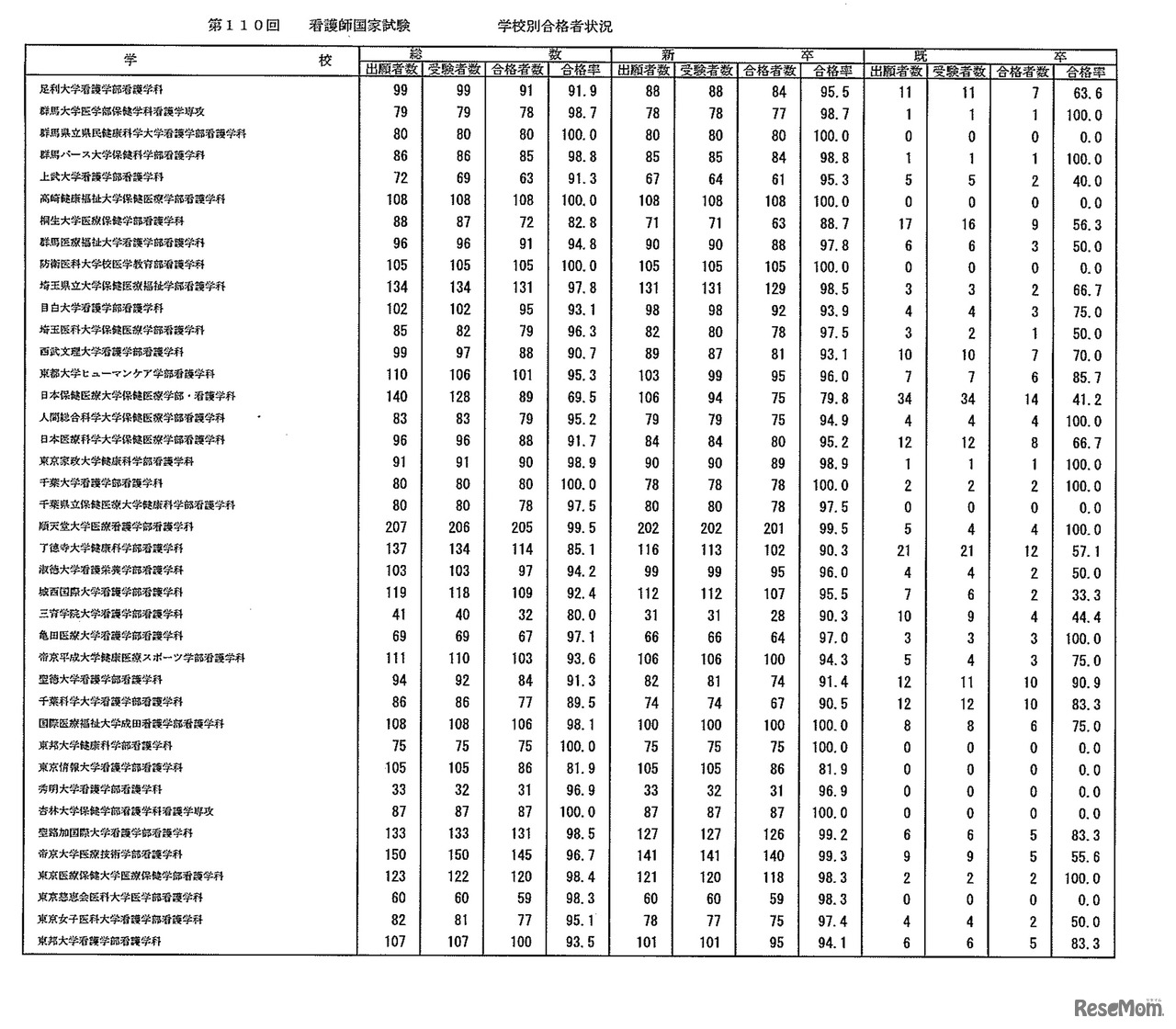 第110回 看護師国家試験 学校別合格者状況:大学
