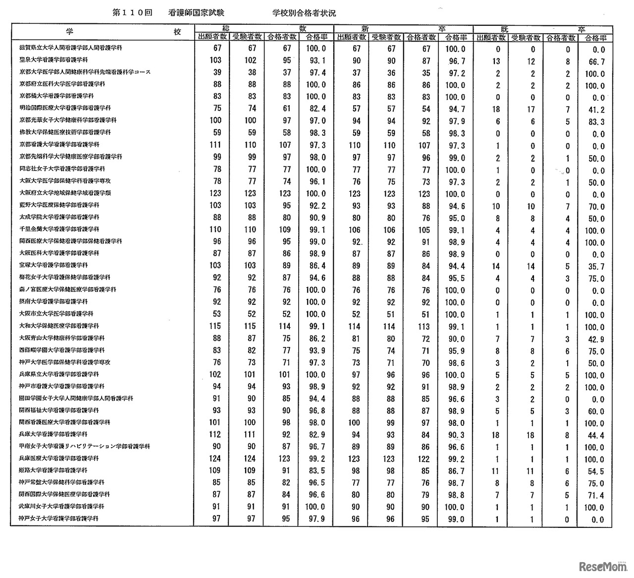 画像出典:厚生労働省 第110回 看護師国家試験 学校別合格者状況:大学