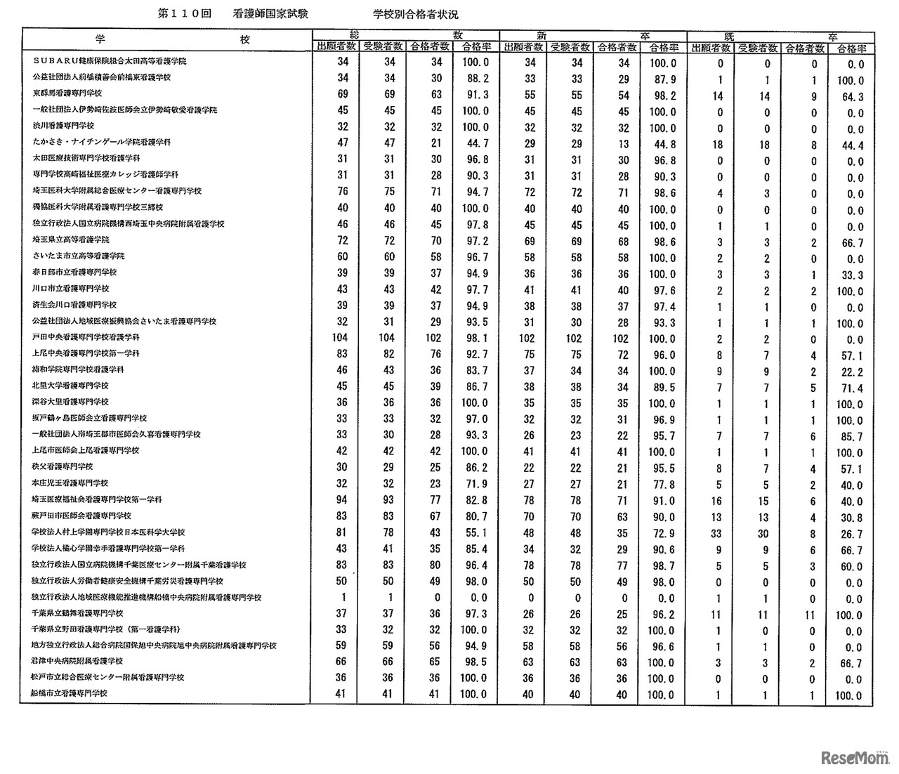 画像出典:厚生労働省 第110回 看護師国家試験 学校別合格者状況:養成所(3年)