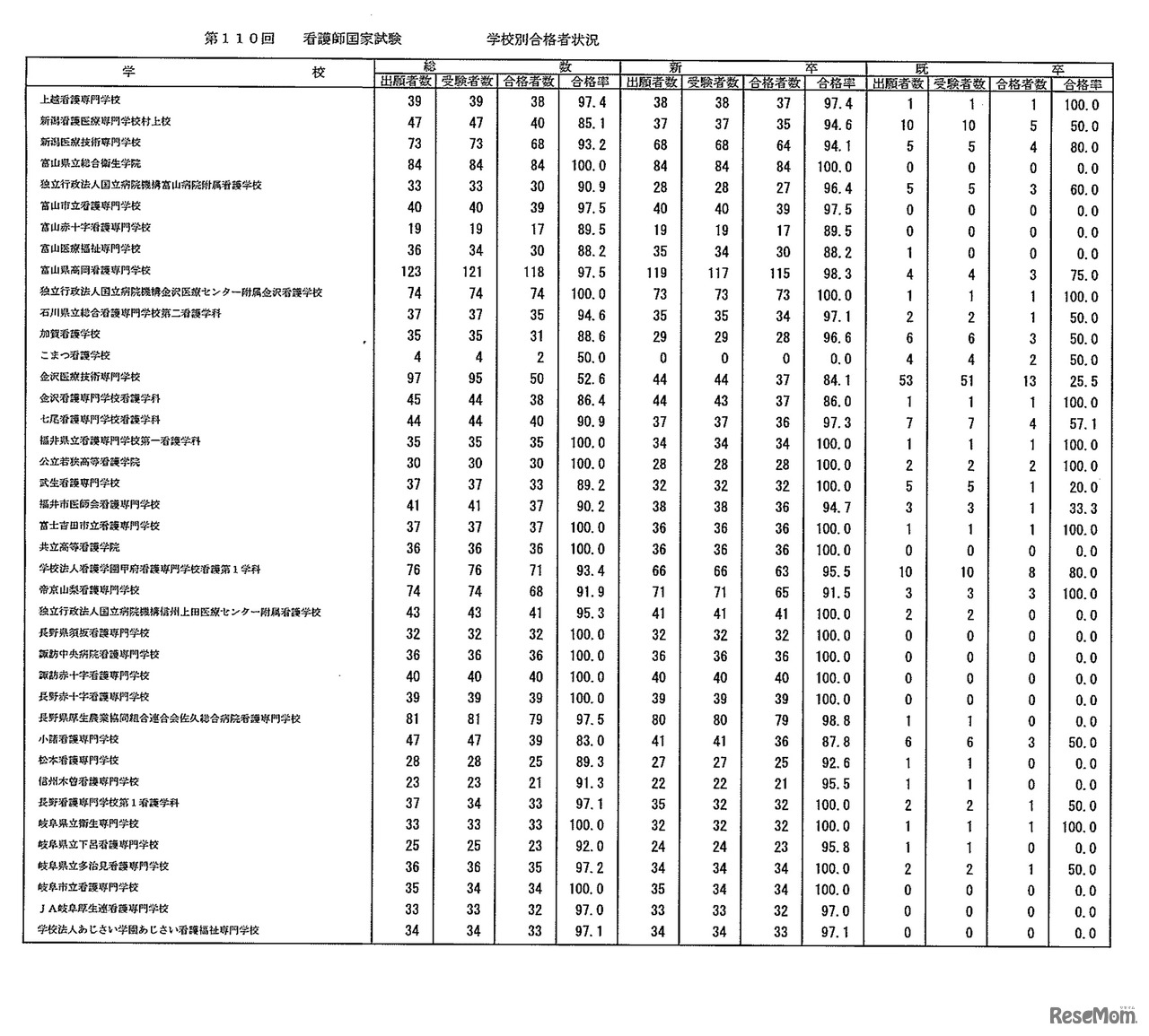 第110回 看護師国家試験 学校別合格者状況:養成所(3年)