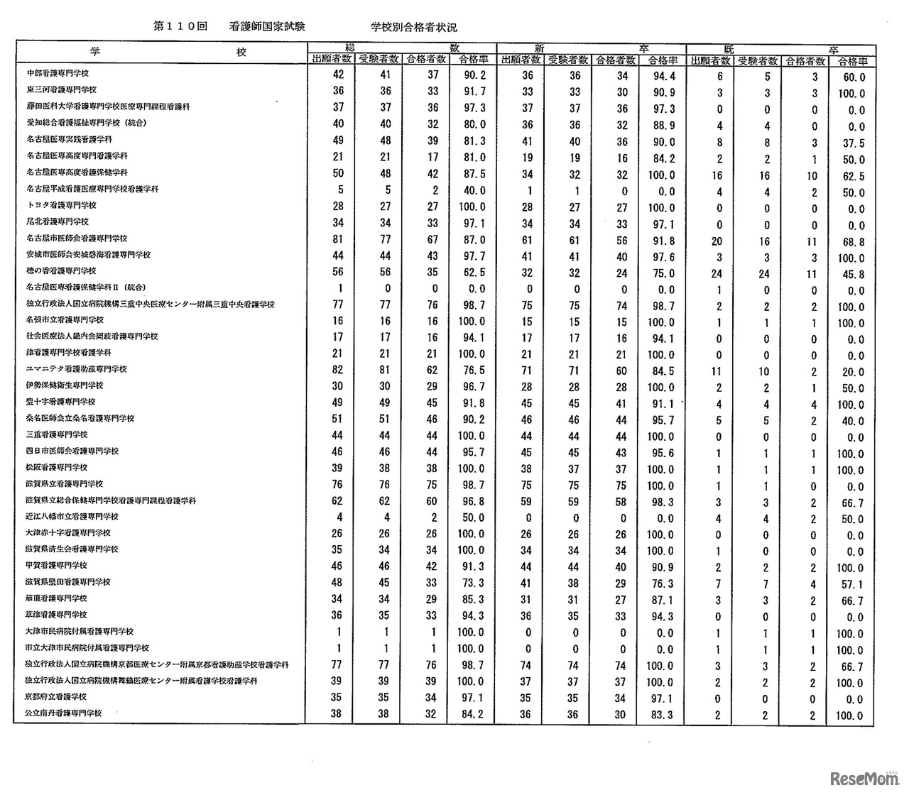 画像出典:厚生労働省 第110回 看護師国家試験 学校別合格者状況:養成所(3年)