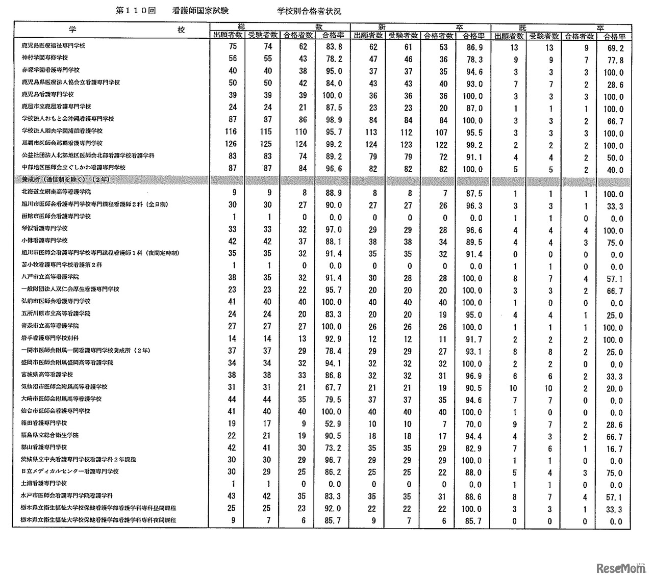 第110回 看護師国家試験 学校別合格者状況:養成所(3年)、養成所(通信制を除く・2年)