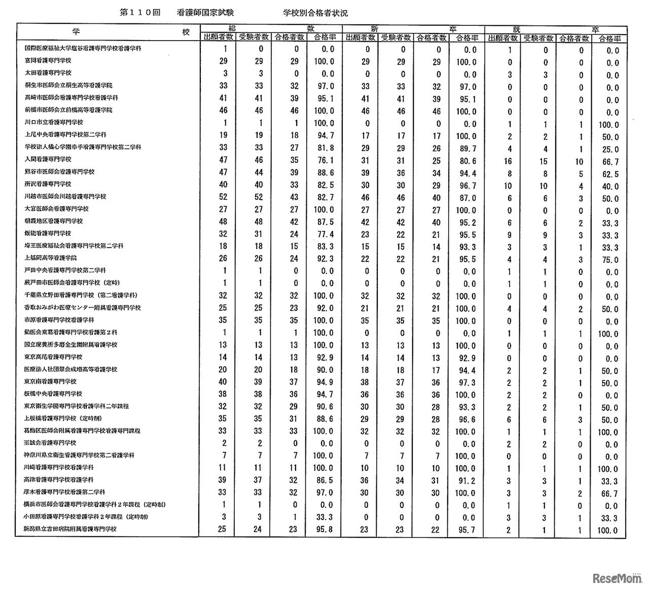 画像出典:厚生労働省 第110回 看護師国家試験 学校別合格者状況:養成所(通信制を除く・2年)