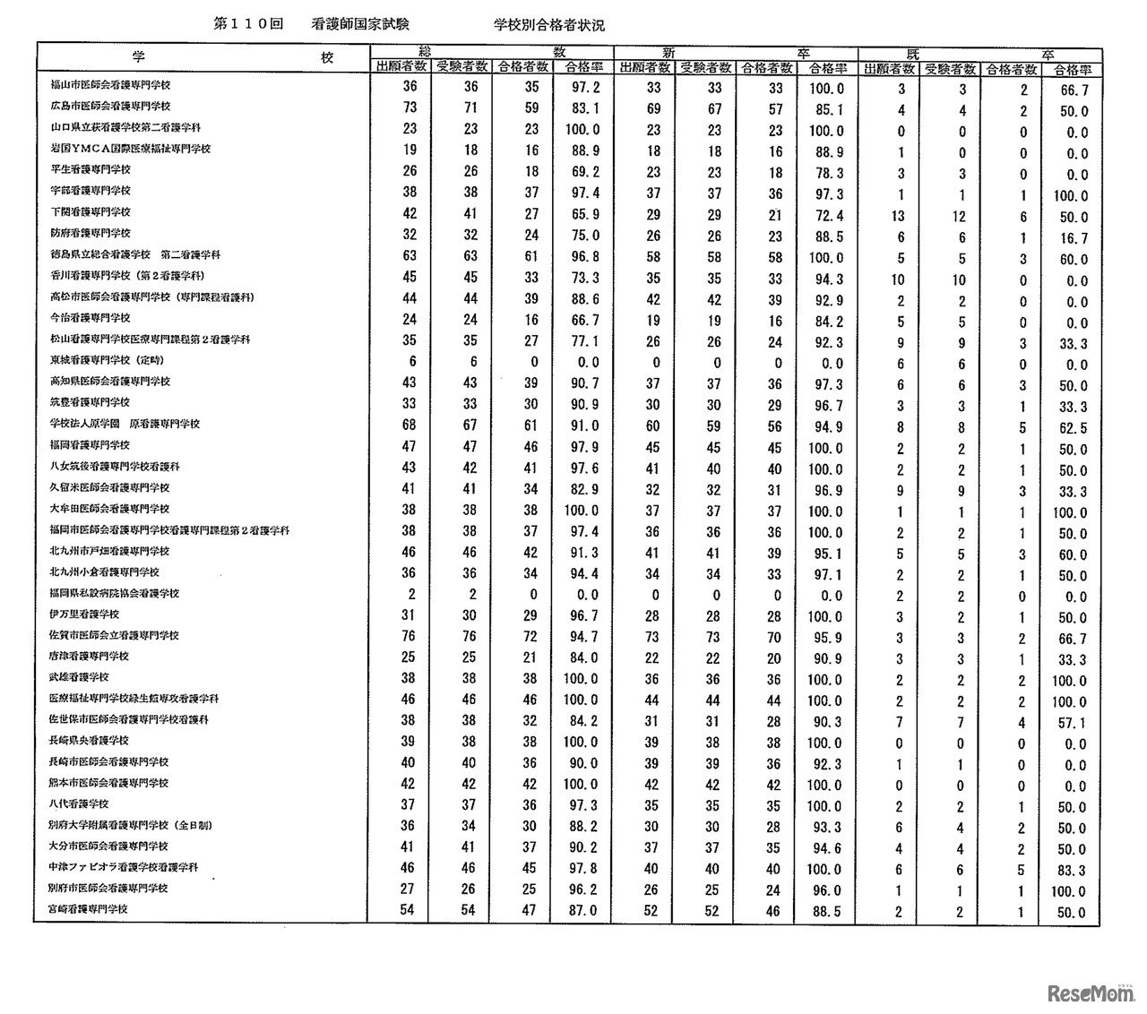 画像出典:厚生労働省 第110回 看護師国家試験 学校別合格者状況:養成所(通信制を除く・2年)
