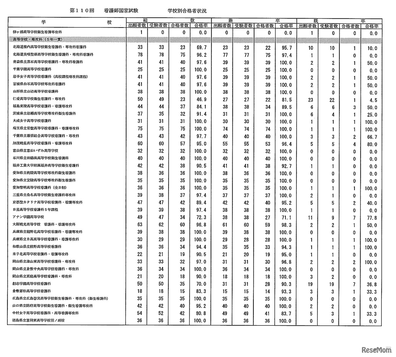 第110回 看護師国家試験 学校別合格者状況:高等学校専攻科(2年)、高等学校・専攻科(5年一貫)