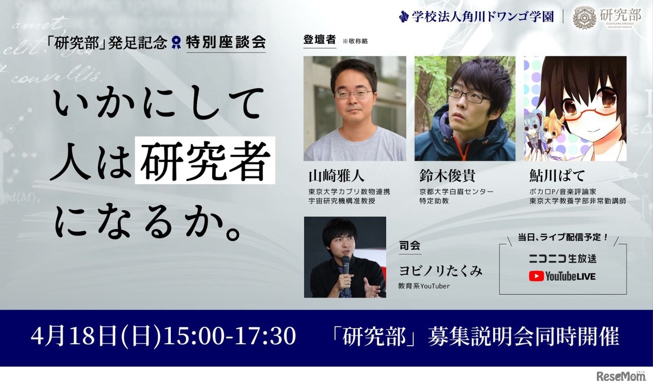 角川ドワンゴ学園は2021年4月、学園の内外を問わず学術研究を志す中高生が世界中から参加できるコミュニティーとして、「研究部」を新たに発足する。生徒を広く募るため、4月18日にオンラインで募集説明会と特別座談会を開催する。