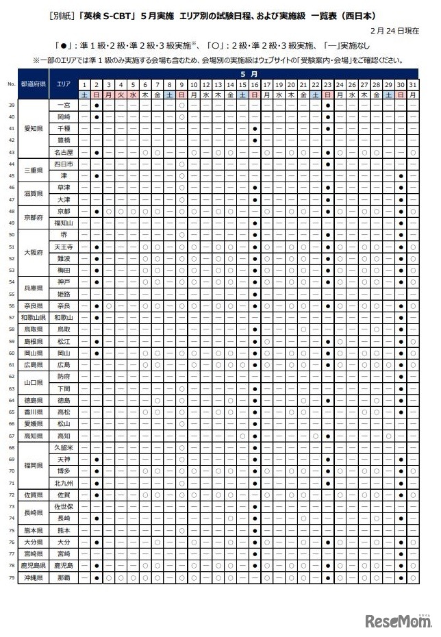 5月実施 エリア別の試験日程、および実施級 一覧表(西日本)