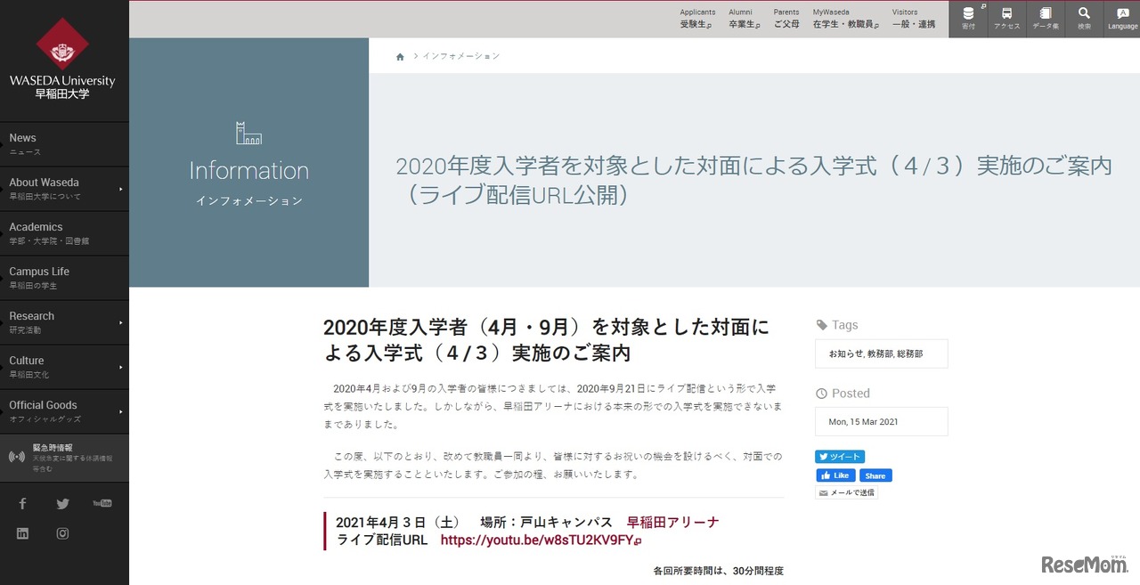 早稲田大学は2021年4月3日、2020年度の入学式を挙行する。名古屋大学や大阪大学も実施することを公表、慶應義塾大学は対面型の特別イベントを開催する。新型コロナウイルスの影響で中止していた入学式を各大学は、1年遅れで祝いの機会を設ける。