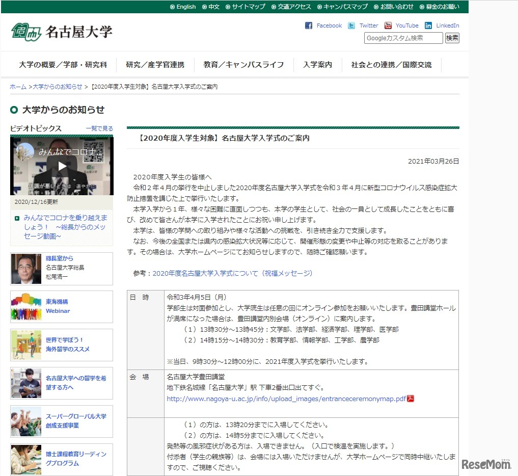 早稲田大学は2021年4月3日、2020年度の入学式を挙行する。名古屋大学や大阪大学も実施することを公表、慶應義塾大学は対面型の特別イベントを開催する。新型コロナウイルスの影響で中止していた入学式を各大学は、1年遅れで祝いの機会を設ける。