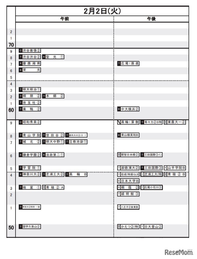 画像出典:日能研「2021年入試による結果R4偏差値一覧」 首都圏(2021年入試結果)男子2月2日