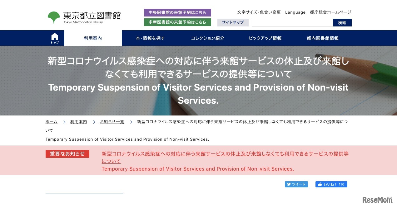東京都立中央図書館および多摩図書館は、2021年4月25日に再度適用された国の緊急事態宣言を受け、新型コロナウイルス感染症の感染拡大防止のため4月25日から当面の間、来館サービスを休止する。引き続き、来館しなくても利用できるサービスを提供する。