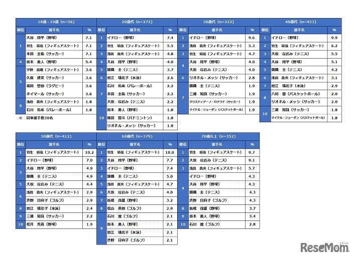 笹川スポーツ財団は2021年5月24日、「スポーツライフに関する調査2020」の結果を公表した。好きなスポーツ選手の1位には、フィギュアスケートの羽生結弦選手が選ばれた。18・19歳に限ると、羽生選手と野球の大谷翔平選手、サッカーの本田圭佑選手の3人が同率で1位だった。