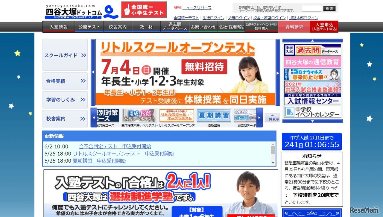 四谷大塚は2021年7月4日、年長から小学3年生を対象に、基本問題からちょっと難しい応用・発展問題まで、幅広いレベルの問題を出題する「リトルスクールオープンテスト」を四谷大塚各校舎で開催する。申込みは7月3日まで。