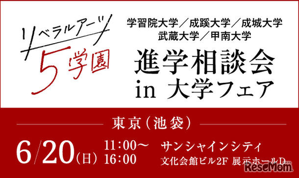 学習院大学、成蹊大学、成城大学、武蔵大学、甲南大学のリベラルアーツ5学園は2021年6月20日、「リベラルアーツ5学園 進学相談会 in 大学フェア2021」を開催する。当日は入場無料で、事前参加申込みが必要。