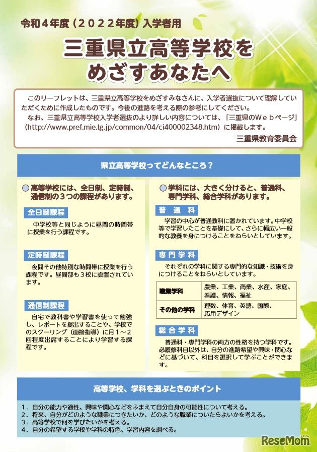 三重県教育委員会は、2022年度(令和4年度)三重県立高等学校入学者選抜の案内を「三重県立高等学校をめざすあなたへ」と題したリーフレットにまとめ、Webサイトに公開した。県立高校の課程や学科、入学者選抜方法、入試日程(予定)等をわかりやすく紹介している。