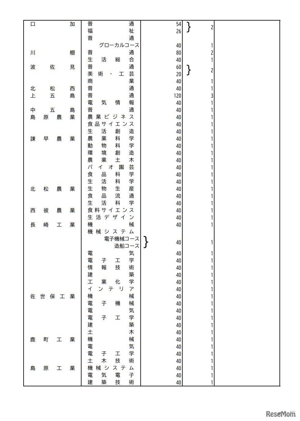 画像出典:長崎県教育委員会 公立高等学校生徒募集定員(全日制の課程)