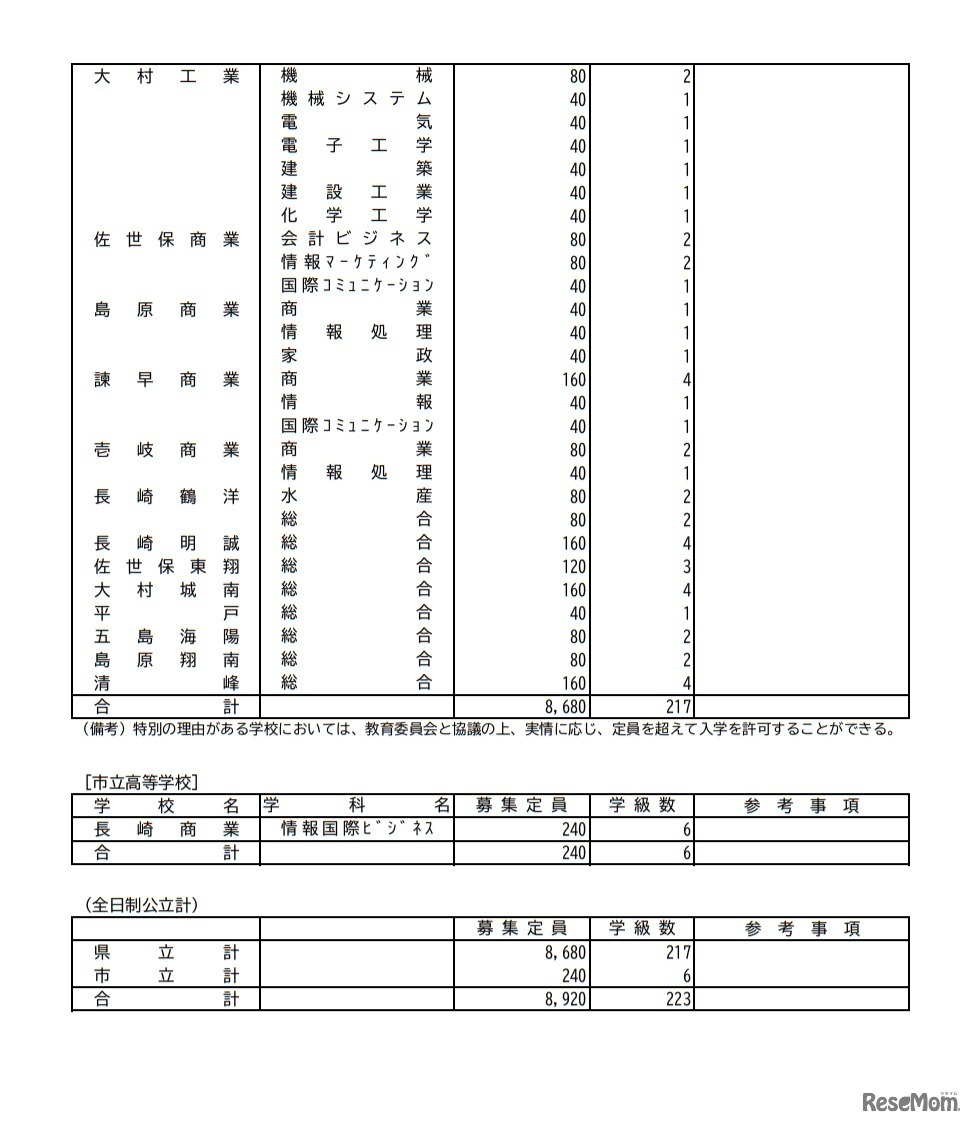 長崎県教育委員会は2021年6月8日、令和4年度(2022年度)公立高等学校・県立中学校生徒募集定員を発表した。全日制の課程の募集定員は、県立8,680人、市立240人の計8,920人だった。