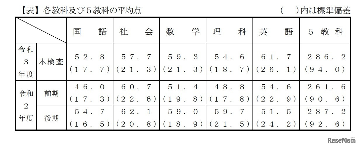 千葉県教育委員会は2021年6月16日、令和3年度(2021年度)公立高等学校入学者選抜の結果を公表した。本検査の学力検査の5教科平均点は286.2点で、前年度(2020年度)の前期選抜より24.6点高く、後期選抜より1.0点低かった。
