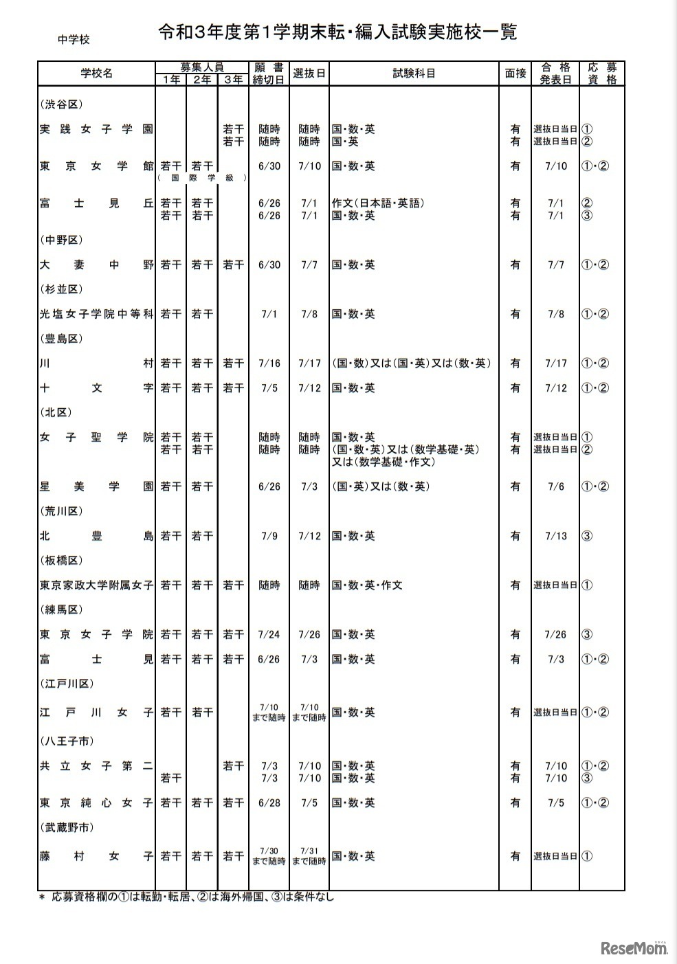 画像出典:東京都 令和3年度第1学期末転・編入試験実施校一覧(中学校)