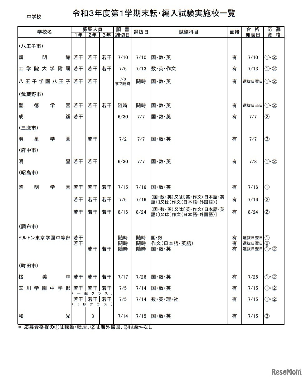 画像出典:東京都 令和3年度第1学期末転・編入試験実施校一覧(中学校)