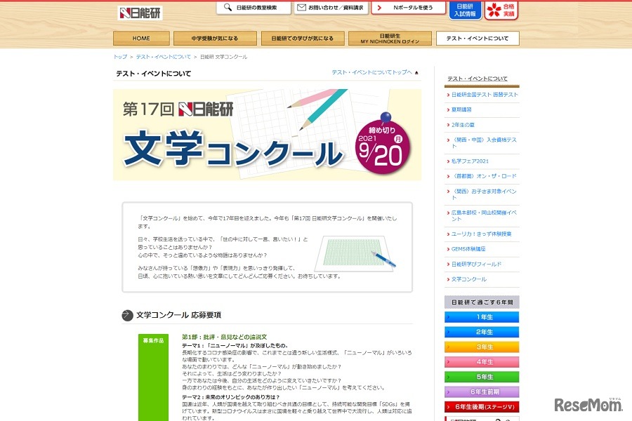 日能研は、中高一貫校に通う中学1年生~高校3年生を対象とした「第17回 日能研文学コンクール」の作品を募集する。募集作品は「批評・意見等の論説文」と「物語等の創作文」の2部門。応募期間は8月2日~9月20日。