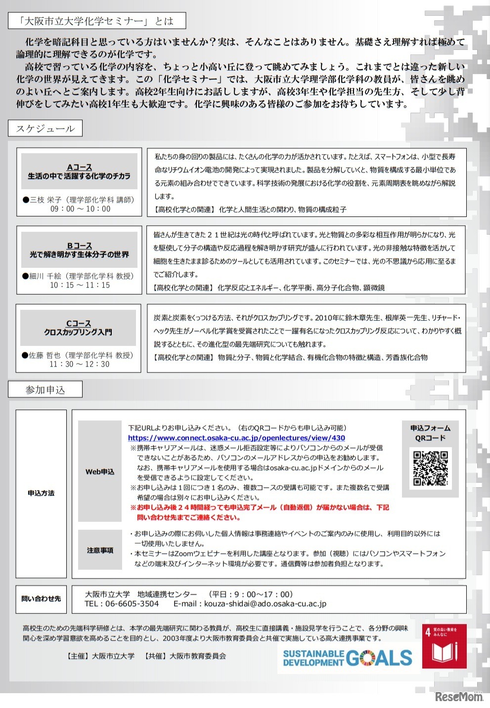 大阪市立大学は2021年7月31日、高校生や化学担当の先生等を対象に、化学セミナー「高校生のための先端科学研修~化学の世界に触れる~」をオンライン開催する。参加無料。