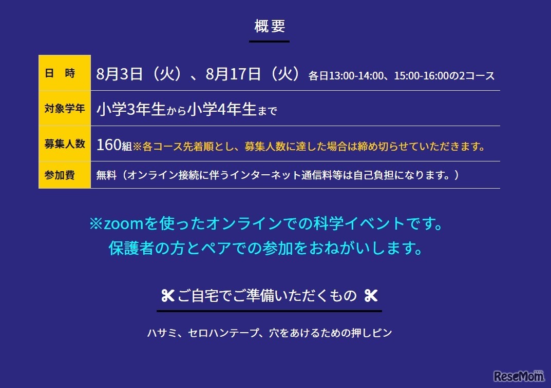 大阪大学部局横断型女性技術職員ネットワークは2021年8月3日と17日、全国の小学3・4年生を対象に科学イベント「親子で遊ぼう!女技の夏休みオンラインサイエンス2021」を開催する。参加無料。