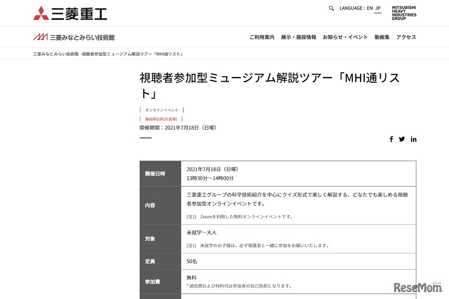 三菱みなとみらい技術館は2021年7月18日、視聴者参加型ミュージアム解説ツアー「MHI通リスト」をオンラインで開催する。参加費は無料。申込みはPeatixのWebサイトで受け付けている。