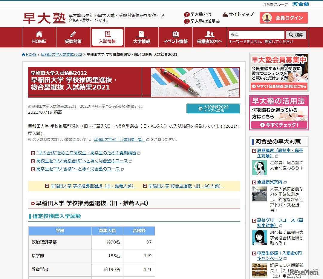 早大塾「早稲田大学 学校推薦型選抜・総合型選抜 入試結果2021」