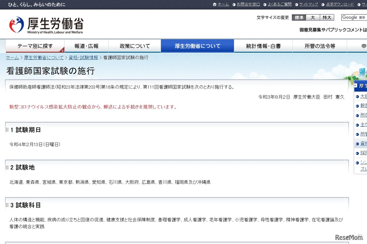厚生労働省は2021年8月2日、第105回助産師国家試験と第111回看護師国家試験の試験期日等を発表。助産師国家試験は2022年2月10日、看護師国家試験は2月13日に実施される。いずれの試験も新型コロナウイルス感染拡大防止の観点から、郵送による手続きを推奨している。