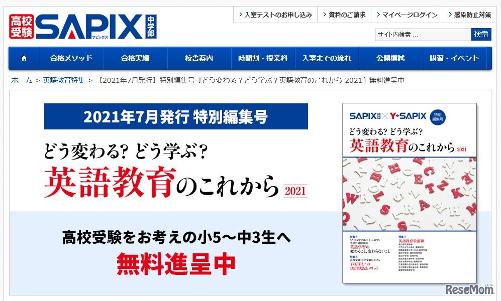 SAPIX中学部は2021年7月、特別編集号「どう変わる?どう学ぶ?英語教育のこれから2021」を発行した。高校受験を検討している小学5年生から中学3年生を対象に無料進呈しており、申込みはSAPIX中学部のWebサイトで受け付けている。